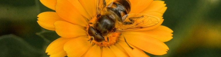 Onward to the community garden, and my eye is drawn to the bed of marigolds that have been left to grow wild and golden. Insects of all kinds love marigolds, and I love photographing insects, so it’s one of my favourite places. A plump hover fly is doing what it does best above one of the taller flowers, and I’m away with the camera.